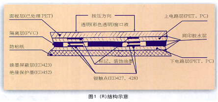 薄膜開關兼有面板和開關的雙重作用 且開關動作行程短 大概為 0.25 ~0.5 mm薄膜開關按壓力為 0.5 ~ 1 N 用手輕觸就能完成開關作用 同時具有密封性 防塵性好 所以廣泛應用在洗衣機的控制面板 微波爐的操作面板以及電子產品中 根據這些產品結構需要 薄膜開關的結構有多種形式 但目前較普通的是( R ) 結構( 如圖1).